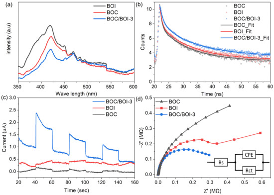 PL measurements were conducted to investigate the recombination behavior of photo-induced e−-h+ pairs in BOC, BOI, and BOC/BOI-3, as shown in Figure 9a. The BOC/BOI-3 composite exhibited a lower PL emission intensity than BOC and BOI, which indicates the reduced recombination of e−-h+ pairs in the BOC/BOI-3 sample. Furthermore, we adapted time-resolved photoluminescence spectroscopy (TRPL) to estimate the lifetime of the excited charge carriers (Figure 9b and Table S1). The average lifetimes (τavg) of BOC/BOI-3 (8.80 ns) are longer than that of the BOC (7.42 ns) and BOI (7.91 ns). The longer τavg indicates that the recombination rate of the photogenerated charge carriers is reduced. Thus, the BOC/BOI composite led to more efficient separation of electron–hole pairs. We also measured the transient photocurrent response of the samples to examine the separation efficiency of the photo-excited charge carriers, as shown in Figure 9c. The BOC/BOI-3 has a higher photocurrent response than both the pristine BOC and BOI samples. The strong photocurrent response reveals the enhanced separation and transfer of the photogenerated charge carriers in the BOC/BOI composite. Next, an EIS Nyquist plot was taken to examine the electrode/electrolyte interfacial charge transfer resistance, as shown in Figure 9d. The Nyquist plot can be well-reproduced into solution-spreading resistance (Rs) and charge transfer resistance (Rct), in parallel with the constant-phase element (CPE) (inset of Figure 9d) [50]. The Rct values for BOC, BOI, and BOC/BOI-3 are 0.43, 0.64, and 0.32 MΩ, respectively. The smallest Rct of BOC/BOI-3 has a lower charge transfer resistance than BOC and BOI. Therefore, these results suggest that the BOC/BOI-3 heterojunction can effectively suppress the recombination of photo-excited charge carriers, which will effectively improve the photocatalytic performance of the BOC/BOI-3 heterostructure.