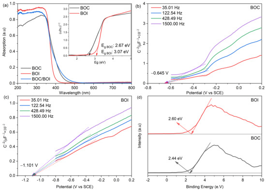 To elucidate the photocatalytic mechanism of the BOC/BOI heterostructure, the electronic structures of BOC, BOI, and BOC/BOI-3 were investigated through measurements of UV–Vis diffuse reflectance spectra (DRS), Mott–Schottky (MS) plots, and valence band (VB) XPS spectra, as shown in Figure 10. First, the UV–Vis DRS of BOC, BOI, and BOC/BOI-3 were measured to investigate optical absorption ability (Figure 10a). The absorption edges for the BOC and BOI were located at around 450 nm and 425 nm, respectively. In comparison, the absorption edge of the BOC/BOI-3 was extended to a longer wavelength of 460 nm. The extended absorption edge of BOC/BOI-3 is attributed to the strong contribution of BOC in BOC/BOI-3 to the absorption of visible light. Moreover, the optical bandgap of BOC and BOI could be obtained by curve fitting of Tauc plotting of (αhν)n versus Eg (inset of Figure 10a), where n = 1/2 for the indirect band gap semiconducting behavior of BOC and BOI [51,52]. The obtained band gaps were 2.67 eV and 3.07 eV for BOC and BOI, respectively.