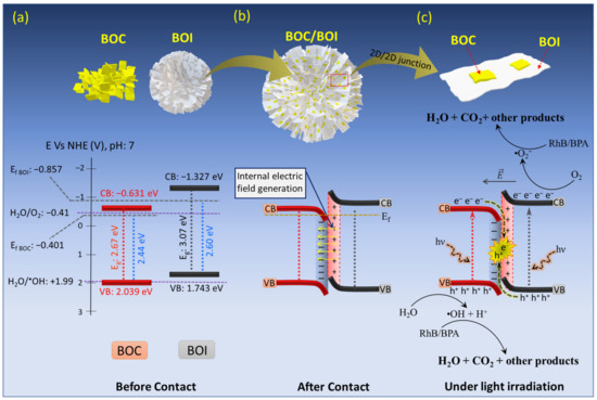 where ECB, EVB, and Eg, denote the CB potential, VB potential and band gap of the sample, respectively. As a result, the calculated CB potentials for BOC and BOI are −0.631 V and 1.327 V vs. NHE, respectively (Figure 11a). Thus, based on the above analysis, the BOC/BOI will make a type-II heterojunction. When BOC and BOI formed the BOC/BOI heterojunction, the electrons would spontaneously migrate from BOI to BOC through the BOC/BOI interface to align the Fermi level because BOI has a higher Ef than BOC. The migration behavior of the charge carriers at the interface is also consistent with the elemental analysis in XPS spectra (as discussed in Section 3.1). This electron migration generates a depletion region at the BOC and BOI interface with an internal electric field (IEF) oriented from BOI to BOC, therefore resulting in the band bending upward for BOI and downward for BOC, respectively, as shown in Figure 11b.