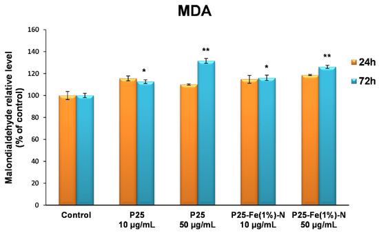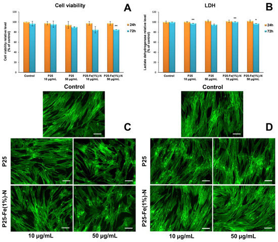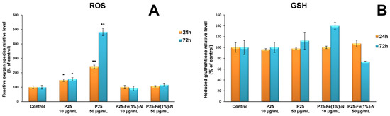 | 72 h MEM + 10% FBS | P25 NPs 10 µg/mL P25 NPs 50 µg/mL P25-Fe(1%)–N NPs 10 µg/mL P25-Fe(1%)–N NPs 50 µg/mL | 3971 ± 360.6 2445 ± 451.6 2978 ± 1063.0 1938 ± 14.8 | −11.60 ± 0.85 −11.40 ± 0.63 −8.14 ± 0.94 −10.70 ± 1.46 |