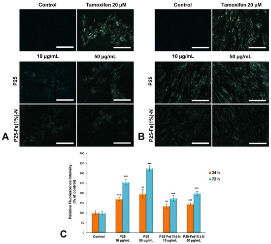 - Nica, I.C.; Stan, M.S.; Popescu, R.G.; Nicula, N.; Ducu, R.; Diamandescu, L.; Dinischiotu, A. Fe-N co-doped titanium dioxide nanoparticles induce cell death in human lung fibroblasts in a p53-independent manner. Int. J. Mol. Sci. 2021, 22, 9627. [Google Scholar] [CrossRef] [PubMed]