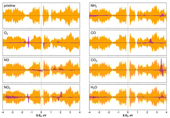 The density of electronic states of the V3S4 monolayer before and after the adsorption of CO, CO2, H2O, O2, NH3, NO, and NO2 gas molecules. Orange and violet colors denote the contribution from the V3S4 monolayer and gas molecules, respectively. The Fermi level shifted to zero. The contribution from gas molecules was enlarged by 4 times for CO, CO2, O2, NO, and NO2 molecules and by 20 times for the H2O and NH3 molecules.