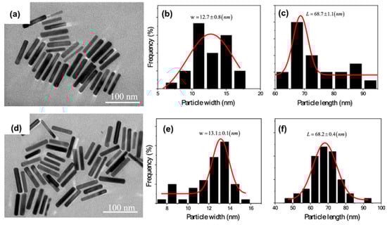 TEM images, diameter, and length distribution of GNR-CTAB (a–c) and GNR-PSS (d–f). (Reprinted with permission from [48], Copyright 2022, Springer Nature Switzerland AG.)
