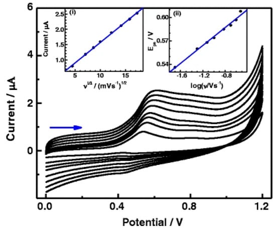 Cyclic voltammetric response of GC/Au-bt to 100.0 μM As(III) oxidation at different scan rates. Inset (i) shows the plot of the oxidation peak currents against the square root of scan rates and inset (ii) shows the plot of the oxidation peak potential against the log of scan rate. (Reprinted with permission from [53], Copyright 2016, Springer Nature).