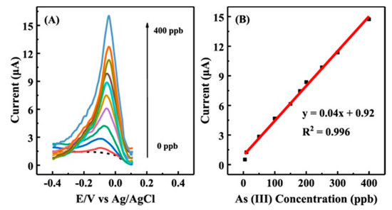 (A) SWASV response of different concentrations of As(III) on Au-PANI-Fe-CNFs/GCE. (B) Linear calibration curve of peak current versus As(III) concentration (0–400 ppb). (Reprinted with permission from [54], Copyright 2020, Elsevier B.V.)
