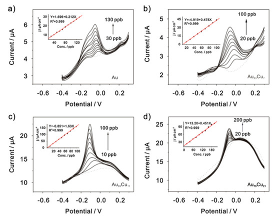 Recently, a simple hydrothermal method for the preparation of Au and Cu bimetallic nanoparticles of different compositions has been proposed [134]. The electrochemical performance of Au-Cu bimetallic nanoparticles in the determination of As(III) particle concentration was investigated using the square-wave anodic dissolution voltammetry SWASV method, and the SWASV response for As(III) detection in different concentration ranges is shown in Figure 14, where the Cu content in Au-Cu bimetallic nanoparticles is crucial for the detection efficacy. Compared with gold nanoparticles and gold electrodes, Au-Cu bimetallic nanoparticles exhibited better electrochemical performance with a lower detection limit (2.09 ppb) and higher sensitivity (1.63 μA ppb−1 cm−2). In addition, the Au-Cu bimetallic nanoparticles also exhibited superb anti-interference performance for the detection of As(III).