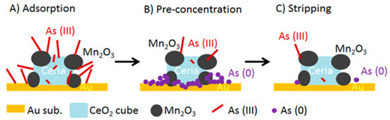 Schematic diagram of electrochemical analysis of arsenic on Mn2O3/CeO2/gold electrode. (A) Adsorption, (B) pre-concentration, (C) stripping. (Reprinted with permission from [146], Copyright 2018, Wiley-VCH Verlag GmbH & Co. KGaA, Weinheim.)