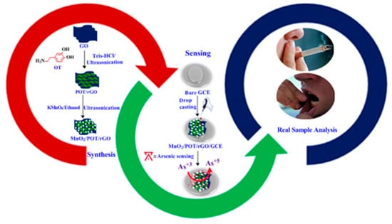 Synthesis of MnO2/POT/rGO nanocomposites and arsenic detection process. (Reprinted with permission from [147], Copyright 2020, Springer Nature Switzerland AG.)