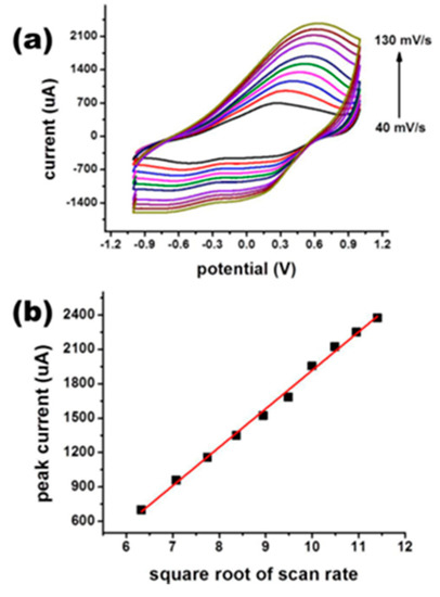 (a) Current response at different scan rates; (b) oxidation peak current and scan rate linear calibration curve (Reprinted with permission from [151], Copyright 2018, Elsevier B.V.)