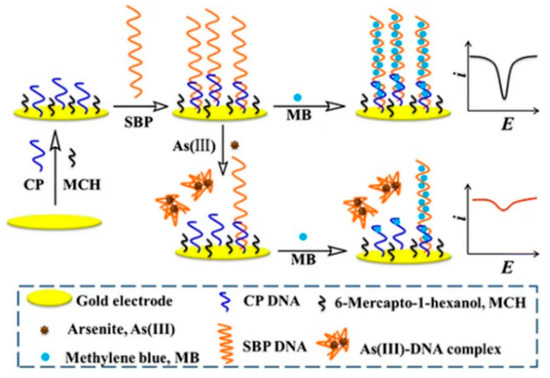 - Wen, S.; Zhang, C.; Liang, R.; Chi, B.; Yuan, Y.; Qiu, J. Highly sensitive voltammetric determination of arsenite by exploiting arsenite-induced conformational change of ssDNA and the electrochemical indicator Methylene Blue. Microchim. Acta 2017, 184, 4047–4054. [Google Scholar] [CrossRef]