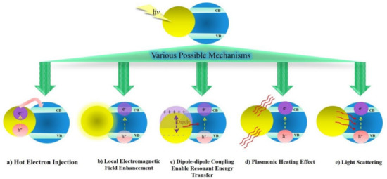There are various localized surface plasmon resonance mechanisms of photoactivity by which metallic nanostructures may intensify semiconductors’ photocatalytic behavior [45,46,47]. Globally, five mechanisms explain exhaustively how metallic SPR enhances semiconductor photoactivity: (i) hot electron injection (or direct electron transfer [48,49]); (ii) local EM field enhancement (or light concentration [50]); (iii) dipole–dipole coupling enabling resonant energy transfer (or plasmon-induced resonant energy transfer [51]); (iv) the plasmonic heating effect [52]; and (v) light scattering [53]. These master processes are summarized schematically in Figure 3.