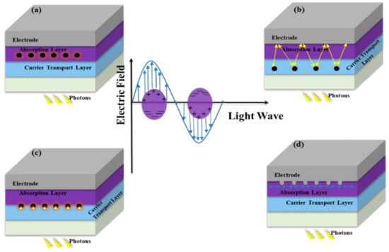 After letting more light enter the solar cell, the second important purpose is to enhance the optical path length of the photons in the active layer. To obtain this goal, the inner side of the back surface of the cell needs to be textured properly to make longer wavelengths scatter and diffract back into the active absorption layer, as shown in Figure 8d. A plasmonic nanostructure can be applied in the thin-film solar cell to harvest the maximum amount of trapped light [163,164,165]. This plasmonic nanostructure can be designed to absorb different wavelengths of light, such as those in the infrared [166,167,168] and visible range [169].