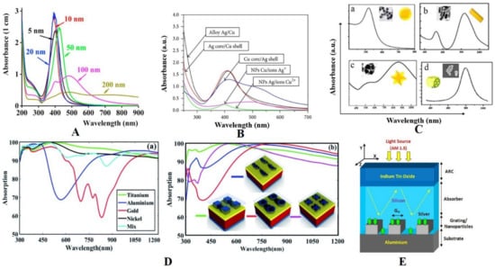 (A). Absorbance spectra of different sizes of Ag NPs [157]. (B). Absorbance spectra of bimetallic (Ag/Cu) nanoparticles [158] (reprinted with permission of Creative Commons Attribution License). (C). Various types of gold nanoparticles and their UV absorption (Reprinted with permission of Elsevier and Copyright Clearance Center): (a) spherical gold nanoparticles, (b) gold nanorods, (c) gold nanostars, (d) gold nanocages. [159] (D). Influence on optical absorption with (a) different materials and (b) different shapes of NPs [160] (Reprinted with permission from [160], 2019, Creative Commons Attribution—Noncommercial 3.0 Unported License.). (E) A schematic diagram of an ultrathin silicon solar cell representing 20 nm-diameter Ag NPs periodically substituted on the Al gratings to enhance the light-trapping mechanism [154].
