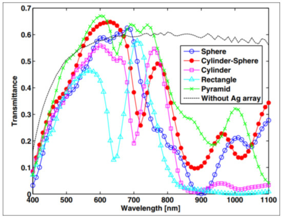 Bottom configuration: the silver nanoparticle arrays with individual particles shaped as rectangles or cylinders gave rise to the lowest transmittance curves [172]. Reprinted with permission from [172], 2012, American Chemical Society.