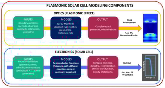 - Li, X.; Hylton, N.; Giannini, V.; Lee, K.-H.; Ekins-Daukes, N.; Maier, S. Bridging electromagnetic and carrier transport calculations for three-dimensional modelling of plasmonic solar cells. Opt. Express 2011, 19, A888–A896. [Google Scholar] [CrossRef] [PubMed]