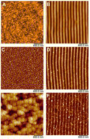 AFM images of pristine PET (A); laser pre-treated PET with LIPSS structure (B); and PET with immobilized AgNPs on pristine PET (C,E) and PET with LIPSS structure (D,F).