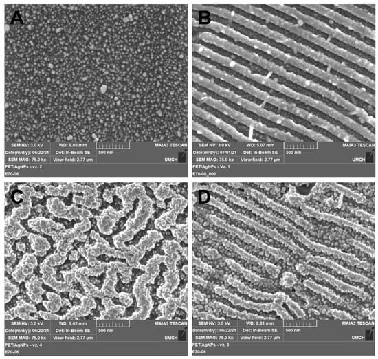The surface morphology of AgNPs decorated polymers was observed also by FEGSEM microscopy (Figure 3) to better visualize the AgNPs through the different material contrast (metal/polymer). Figure 3A,B show smooth and coherently patterned PET (LIPSS) with immobilized Ag nanoparticles under the fluencies of 10 mJ cm−2. Similarly to AFM analysis, it follows from SEM micrographs that under the lower immobilization fluence, the morphology of the underlying polymer remained fully preserved and AgNPs evenly decorated the polymer. When the immobilization fluence increased to 24 mJ cm−2, the most pronounced change in the surface morphology occurred at originally planar polymer, while PET with LIPSS structure exhibited only minor disturbances of the periodic structure (see Figure 3C,D). The cause of this different behavior was discussed in the previous paragraph and most probably was related to the presence of the LIPSS themselves. It is also evident that regardless of the nature of the polymer surface after nanoparticle immobilization (smooth, rough, or with LIPSS structure), the AgNPs were always located at the same surface area of the polymer.