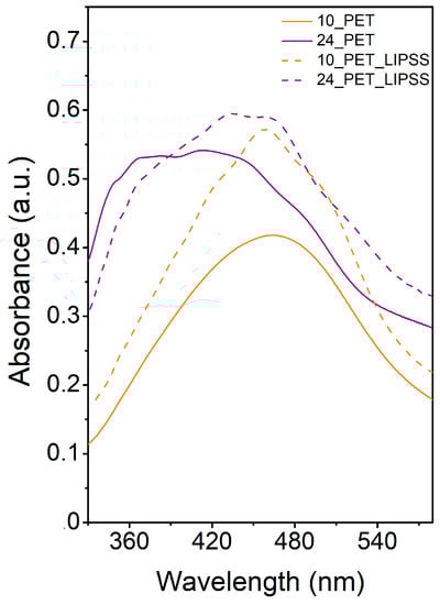 UV-Vis absorption spectra of AgNPs immobilized with the fluence of 10 mJ cm−2 on pristine PET (10_PET) and PET with LIPSS structure (10_PET_LIPSS) and with the fluence of 24 mJ cm−2 on pristine PET (24_PET) and PET with LIPSS structure (24_PET_LIPSS).