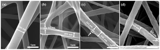 The samples in Figure 2 show the nanofiber morphologies, as seen in SEM. Sample V is quite uniform and smooth, and there are no observable pores or stratifications (Figure 2a). Vacuum drying at RT, 55 °C, 75 °C, or 95 °C brought no observable change to the surface morphology, as seen via SEM (figures not shown). However, after selective dissolution of PVP, all nanofiber samples (VRT-SD, V55-SD, V75-SD, and V95-SD) exhibited significantly different surface morphologies. Sample VRT-SD showed a quite noticeable roughness of ~64 nm and a remarkably reduced fiber diameter (from 844 to 453 nm, cf. Figure 2a,b). Sample V55-SD exhibited rough fiber surfaces with obvious grooves and depressions. The roughness was estimated as 164 nm, and the fiber diameter was found to only be reduced from 844 to 646 nm (cf. Figure 2a,c). The nanofiber morphologies of samples V75-SD and V95-SD were similar, so that the SEM image of V75-SD does not have to be shown here. The surface of sample V95-SD showed obvious roughness with some grooves (cf. Figure 2d), but the roughness was lower than that of sample V55-SD and higher than that of sample VRT-SD. In agreement with the roughness variation, the diameters of V75-SD and V95-SD were found to be between those of samples VRT-SD and V55-SD.