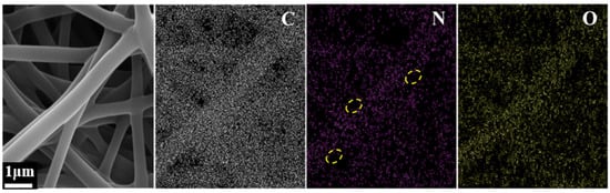 The two panels in Figure 3 show the element distributions in samples VRT and V55 obtained by means of EDX mapping. As expected, both samples contained Carbon, Oxygen, and Nitrogen. Vacuum drying at RT led to homogeneous distributions of C, O, and N on the nanofiber surfaces of sample VRT (top panel of Figure 3). Vacuum drying at the elevated temperature of 55 °C yielded quite a different element distribution for sample V55. The bottom panel of Figure 3 reveals a homogeneous distribution of C and O, but a heterogeneous distribution of N on the nanofiber surface of sample V55. The black regions enclosed by yellow ellipses near the nanofiber contours indicate a lack of Nitrogen and thus a nonuniform overall concentration of PVP. The concentration variation of the PVP resulted from the morphology variations between samples VRT and V55, as the surface roughness of V55 was achieved through the removal of the PVP in ethanol.