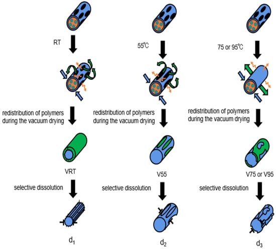 The observations suggest a hypothesis (schematically shown in Figure 4) for the surface reconstruction during vacuum drying at either RT or elevated temperatures. The surface morphologies can be traced back to the electro-spinning process, in which electrostatic repulsion of surface charges deforms each PVA/PVP droplet into a Taylor cone. The charged jet ejected from the Taylor cone is stretched and split into new finer jets, so that water evaporates quickly and leaves PVA as the polymer to crystallize first, if the very high solubility of PVP in water is taken into account. On the other hand, PVP and the remaining water still exist as a concentrated solution inside the nanofibers, as evidenced from the high softness and stickiness of sample V. Therefore, the inner-liquid and outer-crystallizing process can be reasonably assumed to yield to nanofiber shells that are metastable, mesh-like PVA layers [17]. The subsequent vacuum drying at RT allows the internal water in the fibers to carry PVP molecules uniformly from the inside to the outside through the PVA mesh-like layers. Capillary forces from the PVP/water migration and compression forces from the water evaporation can lead to significant cracking and shrinkage of the PVA mesh-like layers. Thus, after the PVP removal by selective dissolution, a significant reduction of the nanofiber diameter and a slightly wrinkled nanofiber surface can be expected—as seen in the SEM image of sample VRT-SD in Figure 2b. In the case of vacuum drying at the elevated temperature of 55 °C, the mesh-like PVA layer is thermally softened. Therefore, the capillary force from water migration leads to deformation instead of cracking in the PVA mesh. The following water evaporation boosts the formation of this undulating profile on the PVA layer. As a result, after selective dissolution, the nanofiber has no obvious reduction in diameter but exhibits a significant increase in rough surfaces (cf. Figure 2c).