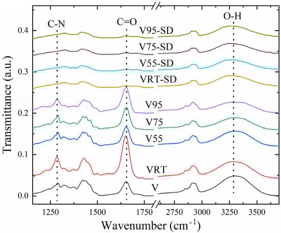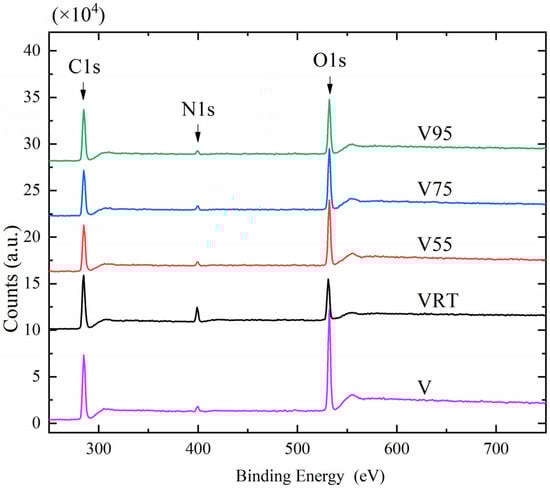 The water evaporation is evident from the results of Fourier-Transform Infrared (FTIR) and X-ray Photoelectron Spectroscopy (XPS) scans. In Figure 5, the FTIR peaks at 1660 and 1290 cm−1 are attributed to C=O and C-N bonds in ketone, respectively, and the broad peak at ~3300 cm−1 indicates hydrogen bonds [18,19]. Taking sample V as a reference, the PVP content, quantifiable by the signature peak for C=O bonds at 1660 cm−1, shows an increase, followed by a decrease and a second increase, i.e., changes to 197%, 31%, 51%, and 74%, respectively, for VRT, V55, V75, and V95.