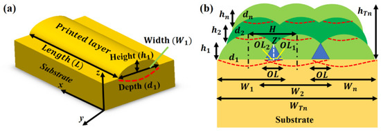 For a given row, the depth of each printed layer is constant. Considering the 1st and 2nd rows, after depositing the layers in the 1st row, the laser beam generates a melt-pool depth in 1st layer to make bonding between 2nd and 1st layers. All printed layers have the same height and melt-pool depth for a given row. Figure 2a shows that 1st layer with the dimensions (L × W1 × h1) is printed with a melt-pool depth (d1) in the substrate (base plate). In LPBF, hatch distance (H) is essential for printing multiple layers, which defines the OL between two adjacent layers, shown by blue color in Figure 2b. This OL decreases the net width of the final manufactured part. To deposit the next row containing n-layers, the re-coater spreads a powder layer melted by the laser beam to a depth in the previously deposited layer to make a bonding. It reduces the net height of the manufactured component.