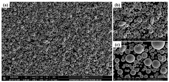 Figure 6a–c shows the SEM images of Co–Cr powder particles at 500 µm, 200 µm, and 50 µm resolutions, respectively.
