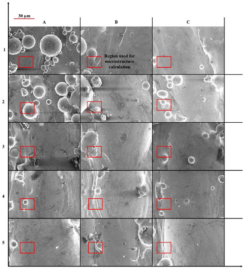 Figure 8 shows the morphologies of the 15 printed samples. A lack of fusion (LOF) defect has been identified in the printed samples, caused by the lack of energy input during the LPBF printing. In this type of defect, poor bonding and un-melted region are two primary reasons. A laser beam melts metallic powder particles selectively in the LPBF process. When the laser energy input is low, the diameter of the molten pool becomes small due to insufficient overlap between the tracks. Inadequate layer overlap between the scan tracks results in the un-melted regions formations. Remelting these powders becomes extremely difficult while adding a subsequent layer. As a result, the LPBF-fabricated part develops partial fusion holes. If the laser energy input is insufficient to induce a sufficient melt pool depth, LOF defects may occur due to insufficient interlayer bonding. Consequently, LOF defects in the scan tracks and deposited layers are frequently encountered. Additionally, the surface of a faulted area becomes rough, contributing to the molten metal’s inefficient flow, resulting in interlayer defects. Interlayer defects may gradually develop and propagate upward during a continuous deposition process for multi-layers printing [40,41]. From the figures, it can be analyzed that all the samples yield LOF-based defects. The areas marked with a red-colored square have been used for microstructure calculation utilized to validate the developed model and presented subsequently.