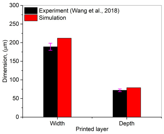 To validate the simulation model estimation for the printed layer’s width and depth, the authors have opted the published data from the study of Wan et al. [43]. In the mentioned study, the authors printed the samples with the following dimensions: 10 × 10 × 10 mm3 using Co–Cr alloy powder particles with laser power = 300 W, laser scanning speed = 900 mm/s, and hatch distance = 0.05 μm. The comparison results have been presented in Figure 10. It can be seen that the model was able to estimate results with 8–10% mean absolute deviations, which is due to the negligence of melt-flow surface tension during analytical modelling.