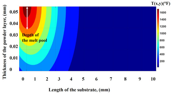 Figure 12 displays the temperature distribution across the depth of the powder layer. The red area shows the location of the laser beam at the top of the powder layer. The thermal isotherms travel from the top to the bottom of the layer, thus defining the melt-pool depth.