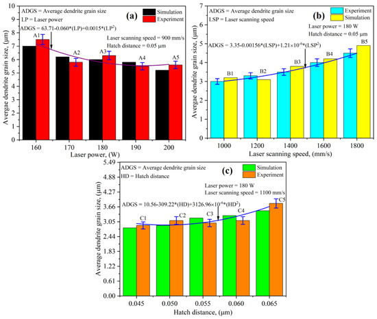 Correlations between operating conditions and average dendrite grain size formation, including laser power, laser scanning speed, and hatch distance, were determined, as shown in Figure 13a–c. In the case of the laser power, it was found that its increment produces fine dendrite grains. This can be explained by the fact that when the laser power increases, it results in higher energy density at a given area, ultimately increasing the thermal gradient and solidification rate. This, in turn, offers dendrite grains with smaller dimensions [46]. A direct correlation has been found between laser scanning speed and average dendrite grain size for the laser scanning speed. When the laser beam travels with a low scanning speed, the thermal gradient and solidification rate decrease with the increment in volumetric energy density due to the higher amount of accumulated heat in the sample, yielding an elevated average dendrite grain size [46]. In the case of the hatch distance, the data trend shows that an increase in the hatch distance resulted in a higher average dendrite grain size value. A hatch distance is defined as the distance between two consecutive laser scans. Usually, this distance has an inverse correspondence with deposited layers overlapping. When this distance decreases, the previously deposited layer experiences cyclic thermal loading, thus reducing the average grain size after depositing the successive layer. This process becomes iterative when increasing the number of layers. Additionally, the experimental results were compared with the simulation results. From Figure 13, it can be observed that the computational results showed a deviation from experimental results of 10–15%. The results deduced using the current study presented better outcomes than those provided in ref. [24].