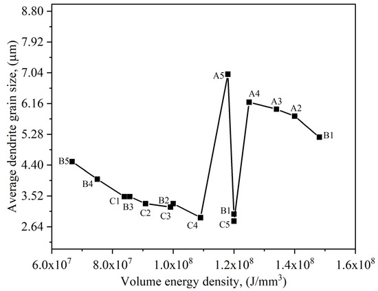 In Figure 14, the dendrite grain sizes as a function of volumetric energy density are presented. From the results, one can identify two trends. One is for the sample series B and C, and another is for the sample series A only, suggesting that the solidification phenomena in sample series A, B, and C are completely different. Processing maps can be adapted to guide dendrite grain formation. Furthermore, thermal gradient (G) and solidification rate (R) can be translated into operating conditions to generate a process map easily interpreted. In the laser-based AM processes, G and R show a direct correlation [47]. A higher laser scanning speed causes an increment of R-value that promotes the formation of highly textured grains, while lower laser scanning speed favors equiaxed grains [47]. Conversely, increasing the laser power causes an increment in G [47]. It is important to mention that the G and R are not constant within the melt pool [47]. R is usually very high at the melt pool top and decreases linearly while moving from the top to the bottom [47].