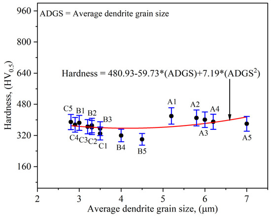 A relationship between the developed average grain size and corresponding experimental hardness value is shown in Figure 15. From the results, one can analyze that the average dendrite grain size is not affecting the hardness value significantly.