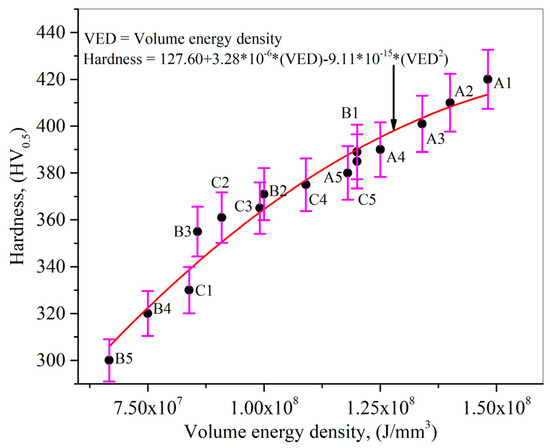 Figure 16 displays the direct correlation between the laser volume energy density and hardness value. An increase in the laser volume energy density conveys more energy to a given area that causes more laser energy storage at that particular region. The indenter will need a higher load to enter that regime, resulting in an elevated hardness value. Upon comparing the results from Figure 15 and Figure 16, it can be concluded that the hardness value is defined by the volumetric energy, involving the thermal gradient and solidification rate, thus defining the printed samples’ morphology.