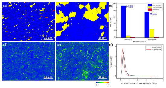 Recrystallized, substructured, and deformed grains in (a) as-sintered and (b) as-extruded composites, (c) statistics of grains in (a,b). KAM maps of (d) as-sintered and (e) as-extruded composites, (f) KAM values, corresponding to (d,e).