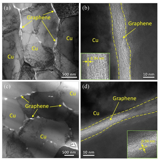 Figure 4 presents the TEM investigation of the as-sintered and as-extruded composites. In Figure 4a,c, the dislocation density in the two composites is low, corresponding to the KAM maps in Figure 3. Graphene sheets are found to be homogeneously distributed and located at grain boundary in matrix. Additionally, the refinement and exfoliation of graphene can be clearly found after hot extrusion, which is consistent with the SEM-BSE observation in Figure 2. Furthermore, Figure 4b,d exhibits the typical HRTEM microstructure of graphene, which is confirmed by the interlayer spacing of about 0.34 nm [39]. The microscopic holes or impurity phases cannot be found at the interface of composite, indicating a well interfacial bonding.
