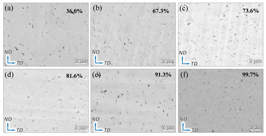 The distribution of recrystallized, substructured, and deformed grains of the as-drawn composites with different drawing reductions: (a) 36.0%, (b) 67.3%, (c) 73.6%, (d) 81.6%, (e) 91.3%, and (f) 99.7%.
