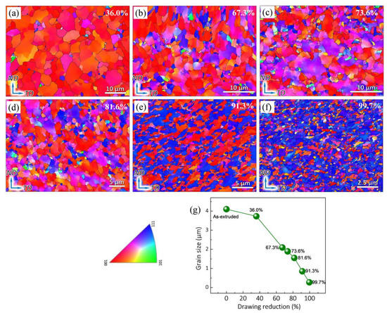 IPF images of the as-drawn composites with different drawing reductions. (a) 36.0%, (b) 67.3%, (c) 73.6%, (d) 81.6%, (e) 91.3%, and (f) 99.7%. (g) The variation of grain size with different drawing reductions.