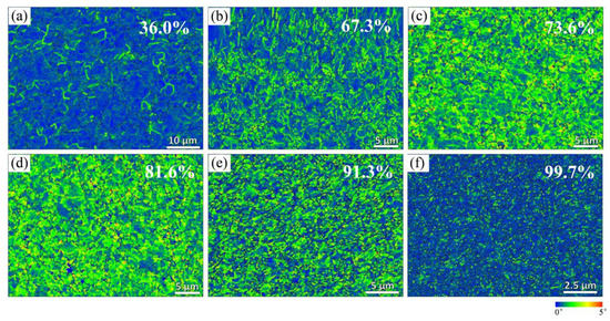 KAM maps of the as-drawn composites with different drawing reductions: (a) 36.0%, (b) 67.3%, (c) 73.6%, (d) 81.6%, (e) 91.3%, and (f) 99.7%.
