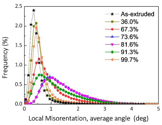Figure 3a,b exhibits three types of grains, namely recrystallized, substructured, and deformed grains, as well as the distribution in the as-sintered and as-extruded composites, respectively. Recrystallized grains (94.6%, see Figure 3c) dominate in the as-sintered composite due to the high temperature and long holding time of sintering. Following the hot extrusion, the percentage of the recrystallized grains drops to 75.4%. To further investigate the microstructure of the composites, kernel average misorientation (KAM) was carried out from EBSD. KAM is often used to analyze the distribution of microstrain in crystals, which is related to the degree of microstrain and dislocation density [37,38]. Figure 3d,e presents the KAM maps of the as-sintered and as-extruded composites, respectively. It can be seen that the microstrain in both composites is relatively small, indicating a low dislocation density. Furthermore, Figure 3e shows the KAM values of the composites and quantitatively describes the variation of KAM values. Herein, it can be seen that the peak KAM values of the two composites are distributed at low orientation angle, indicating a low dislocation density in both as-sintered and as-extruded composites.