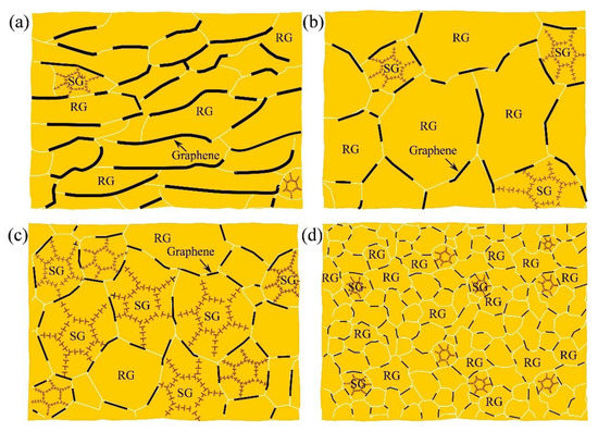Figure 12 is an illustration scheme for the evolution of graphene and matrix during the drawing process. As shown in Figure 12a, original thick graphene sheets are distributed at the interface in the as-sintered composite. Then, the refinement and exfoliation of graphene can be gradually formed with the increasing drawing reductions. The detail mechanism is discussed in Section 3.3. As a result, homogeneously distributed graphene sheets with small pieces and thickness can be obtained in the final composite (see Figure 12d). For the matrix, the grains morphology change from original strip grains to equiaxed grains, corresponding to the as-sintered and as-extruded (or as-drawn) composites, respectively. Additionally, after severe drawing reduction, the recrystallization of composites can be formed, which is affected by a synergistic effect of matrix and graphene (see the discussion in Section 3.4).