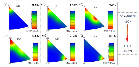 Inverse pole figures of the composites with different drawing reductions: (a) 36.0%, (b) 67.3%, (c) 73.6%, (d) 81.6%, (e) 91.3%, (f) 99.7%.