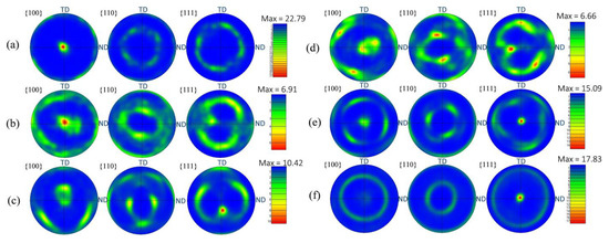 During the drawing deformation of FCC metals, the <100> and <111> orientation will parallel to the axis direction, and form a mixture of <100> and <111> fiber textures. Among them, the <111> fiber texture is considered to be a stable texture, while the <100> fiber texture is a transitional texture. In addition, the <100> fiber texture is mainly attributed to the recrystallization during deformation [51,52]. As shown in Figure S3, a strong and single <100> fiber texture is formed in the as-extruded composite, which can be due to the recrystallization at high extrusion temperature. Figure 13 reveals the inverse pole figures of the composites with the increasing drawing reductions from 36.0% to 99.7%. It can be found that the types of fiber textures are <100> (see Figure 13a), <100> and <112> (see Figure 13c) to <111> and <100> (see Figure 13e), corresponding to the drawing reduction of 36.0%, 73.6%, and 91.3%, respectively. Finally, a mixture of fiber textures with dominated <111> and minor <100> fiber textures is formed when the drawing reduction is 99.7% (see Figure 13f). The texture results reveal that the grains with <100> orientation gradually decrease, while the grains with <111> orientation gradually increase, indicating that the orientation of grains gradually rotates from <100> to <111> orientation during the drawing process. In addition, the final texture induced by the severe drawing reduction is consistent with these results in the drawing deformation of pure Cu, indicating that the incorporation of graphene does not change the type of texture of Cu [53,54]. Although the dynamic recrystallization occurs in the composites after severe plastic deformation, the nucleation and growth of grains are not formed. Therefore, the texture of the as-drawn composite can still retain the fiber texture generated from the drawing deformation of Cu. Figure 14 exhibits the pole figures of the composites with different drawing reductions, which is consistent with the results obtained in Figure 13.