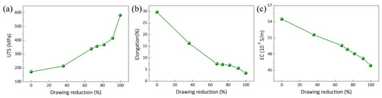 Tensile properties and electric properties of composites with different drawing reductions: (a) UTS, (b) elongation and (c) electrical conductivity (EC).
