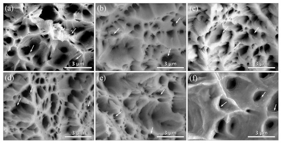 Fracture surface of the composites with different drawing reductions: (a) 36.0%, (b) 67.3%, (c) 73.6%, (d) 81.6%, (e) 91.3%, (f) 99.7%.