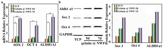 An elevated level of putative CSC markers in cells grown on gelatin@NWF scaffold. (a) RT-qPCR characterized relative mRNA expression of OCT4, SOX2, and ALDH1A1 in cells grown on gelatin@NWF scaffold for 5 and 7 days, * denotes p < 0.05, ** denotes p < 0.01; (b) Western blot analysis to compare the Sox2 (35 kDa), Oct4 (45 kDa), and ALDH1A1 (55 kDa) level compared to GAPDH (36 kDa) in cells grown on TCP and gelatin@NWF scaffold for 5 and 7 days.
