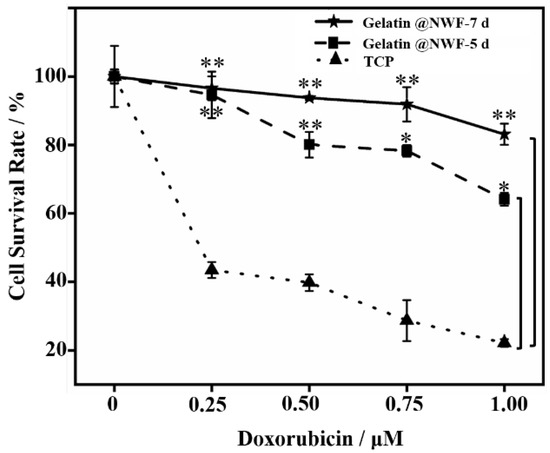 Increased drug resistance of cells grown on gelatin@NWF scaffold. DU 145 cells were cultured on gelatin@NWF for 5 and 7days. Then cells were collected and treated by doxorubicin (0.25∼1 μM) for 48 h. The CCK-8 proliferation assay was conducted to measure cell growth. * denotes p < 0.05, ** denotes p < 0.01.