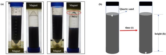 If the network structure of the NC-VES system is unstable or seriously damaged, some or all of the NCs in the system will settle out due to the density difference between the NCs and liquid phase. In this test, the settlement rate of NCs was used to characterize the stability of the NC-VES system. The slower the settlement rate is, the better the stability of the NC-VES. The settlement rates (Equation (1)) were measured by the weighing method with a precision balance (the accuracy was 0.0001 g; Shanghai Fangrui Instrument CO., LTD., Shanghai, China). In this test, the settled NCs were separated from the liquid phase by a magnet as seen in Figure 1a-(2), while the magnet did not suck out the unsettled particles in the system as seen in Figure 1a-(1). Additionally, the effect of various factors on the settlement stability of NC-VES were studied by changing the nanoparticle concentration, shear rate, temperature and pH.