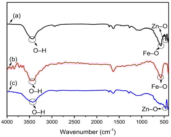 Figure 2 shows the comparison of the chemical structures of Fe3O4, ZnO and Fe3O4@ZnO based on the FT-IR spectra obtained over the wavenumber range of 400–4000 cm−1. The stretching vibration peak at approximately 3410 cm−1 in all the IR spectra is attributed to hydroxyl groups (O–H) due to the adsorbed water molecules on the surface of the samples. The peak at approximately 570 cm−1 represents Fe-O bonds in spectra Figure 2a,b. The stretching peak at approximately 450 cm−1 is related to Zn-O bonds in spectra Figure 2a,c. Both the Fe-O bond and Zn-O bond existing in the synthesized Fe3O4@ZnO composite indicate that ZnO was adsorbed on the surface of the Fe3O4 particles.